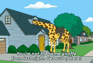 You're not the same giraffe from last night. Get out of here! What the hell? No, no, no, no, no, no, no!