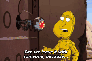 - Can we leave it with someone, because... - No, no. Hey, look! Jabba's cat escaped! I sure hope he doesn't blame the help! (WHINING) Kitty! Kitty! Kitty, kitty, kitty! Kitty! (CLANKING)