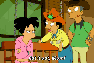 Cut it out, Mom! I'm not interested in any of these gross, ugly losers! What about this gross, ugly, smelly loser? Fry! What you doing here? I'm here to rescue Amy from her robosexual desires.
