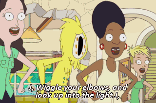 J, Wiggle your elbows, and look up into the light J, J, It's the, it's the J, J, It's the Rick dance J, J, It's the, it's the J, J, It's the Rick dance J, Slow Mobius, hit me with the clock beam!
