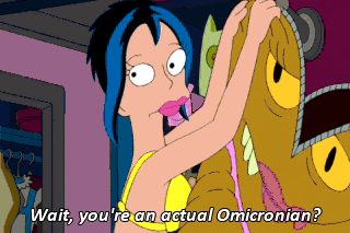 Wait, you're an actual Omicronian? Oh, God. Oh, God, what have I done? This is so hot! Conquer me, Lrrr! Sharpen your horns on my scaly thorax! (SCREAMS) (CRYING)