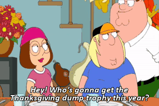 Hey! Who's gonna get the Thanksgiving dump trophy this year? You are! Dad's gonna get it! Who else? (ALL LAUGHING) Loving... Loving family.