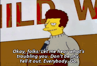 Okay, folks. Let me hear what's troubling you. Don't be shy. Yell it out. Everybody. Go. I, uh, can't commit to a relationship. I'm too nice. I have problems with-- I'm always interrupting people.