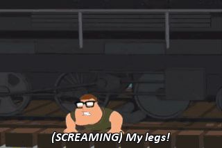 (SCREAMING) My legs! Another train! (SCREAMING) What an odd, clustered train schedule! Hey, sorry you got paralyzed, Joey.