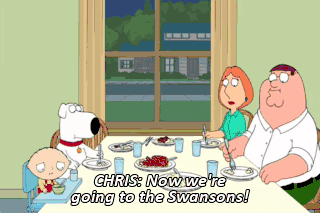 CHRIS: Now we're going to the Swansons! (MEG SOBBING) (CHRIS GRUNTING) (YELLING) Oh, my God! I think Chris is having a heart attack! We're not supposed to leave the table.
