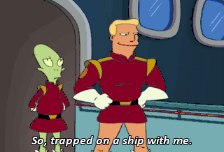 So, trapped on a ship with me. What say you and I knock some very sensual boots? It's tempting but, uh, I have a fiancÉ now. Uh-- Um-- Uh-- Um-- Uh-- Well-- Uh, him! Fry, darling, meet Zapp Brannigan. Huh?