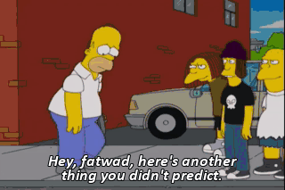Hey, fatwad, here's another thing you didn't predict. - (GRUNTS ANGRILY) - (GRUNTS) (ALL LAUGHING) Ow! Ow! Ow! Ow! Oh, let's go to Moe's. We'll walk and punch. Ow! Ow! Ow! Ow! Huh?