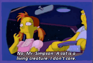 No, Mr. Simpson. A cat is a living creature. I don't care. Now I'm gonna grab me somethin' sweet.
