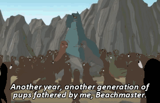 Another year, another generation of pups fathered by me, Beachmaster. (ALL LAUGHING QUIETLY) I'm the greatest, baby! You go, Beachmaster! And so concludes our exploration of planet Earth.