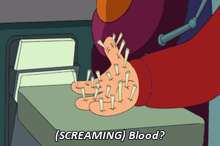 (SCREAMING) Blood? I mean, blood. Put it back in me!