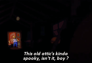 This old attic's kinda spooky, isn't it, boy ? I said, isn't it, boy ? Aaaah ! Don't ever do that to me again !