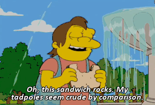 Oh, this sandwich rocks. My tadpoles seem crude by comparison. Ha-ha! You're nocturnal. You don't have to impress me by making fun of others. I already like you.