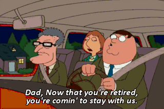 Dad, Now that you're retired, you're comin' to stay with us. No more excuses. I'm putting my foot down. Jeez, Brian, buckle up. Hey, What do you say, Dad? I don't want to be a bother.