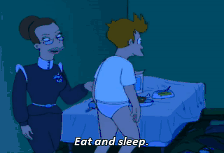 Eat and sleep. Oh, Fry! Uh, wait! Bender's my roommate. He could be back any second. Not likely. I ordered him to flush out the professor's ear wax.