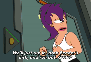 We'll just run in, grab Bender's disk, and run out. Got it? Mm-hmm. Wow! We'll never find that disk, will we, Bender? I am Bender. Please insert girder.