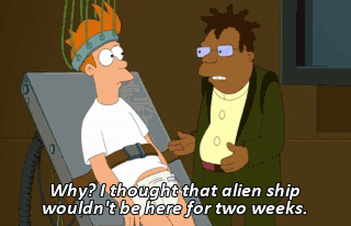 Why? I thought that alien ship wouldn't be here for two weeks. Exactly. And you've been asleep for 13 and a half days. (OMINOUS MUSIC PLAYS LOUDLY)