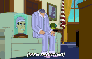 (MEN SHOUTING) (GROANS) What's that? A rock? I hate rocks. (ALL BOOING) What do you stupid voters want now? What possible objection could you have to the G.I. Zapp cartoon?