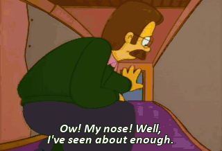 Ow! My nose! Well, I've seen about enough. So, Flanders, what do you think of the house that love built? Aw, shoot!