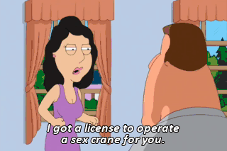 I got a license to operate a sex crane for you. And I got earplugs so I could put up with that (MIMICS BONNIE) horrible voice of yours. I'm not an impressionist, but you get the idea.