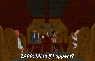 ZAPP: Mind if I appear? Welcome to the Hidey House. Brannigan, tell me about this freaky-deaky escape pyramid. I can fly it, sir. I just need to know where, and how.
