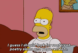 I guess I should look for roofers at poetry slams and yoga retreats. - High five! - Nah. I got standards. I don't hand out high-fives like Chiclets.