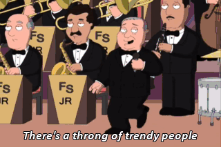 There's a throng of trendy people And they're stretched around the block And there's one unpleasant deaf guy Who just really shouldn't talk Vodka tonic, please.