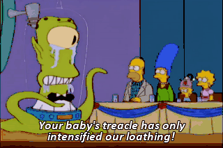Your baby's treacle has only intensified our loathing! Wait! Look at the screen! The baby continues to reminisce.