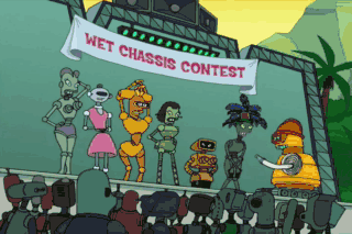 Oh, yeah, baby! Come on! Come on, baby! Poor guy. Maybe you'd feel better if I had a drink. Crummy keg! It's completely tapped-- Oh, you're a robot. - Don't stop. - Ew! Attention, happening robots!