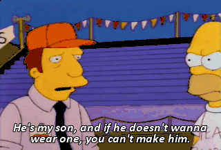 He's my son, and if he doesn't wanna wear one, you can't make him. Okay, fine. I wanna get out of here sometime today. Attention, everyone.