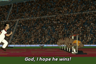 God, I hope he wins! What's this? Hermes Conrad is closing the gap. He's limboed out of retirement and straight into my heart. I say, "Go to hell, Barbados Slim!" Go, bodysuit! Go! Come on!