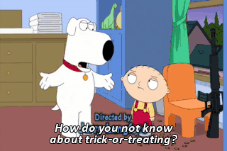 How do you not know about trick-or-treating? Well, how do you not know that your reflection in the patio door isn't another dog? Hey! That guy is a dick.