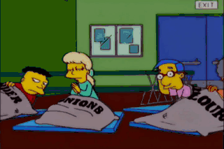Now, children, if you have to answer nature's call during the night, - use this bucket next to Bart's head. - Hey!