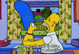 Homer, the sky is blue. Doughnuts are plentiful. Friday is T.G.I.F night on ABC. - What's gotten into you? - Nothing.
