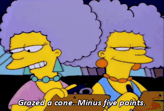 Grazed a cone. Minus five points. Being a jerk. Minus a million points! D'oh! One more wrong answer,