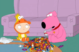 a $64,000 Bar, a Notafinger and a Dawkin's Peanut Butter Disc. God, I hate television. Brian, why are you pink?