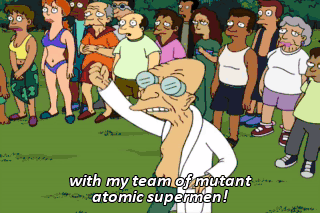 with my team of mutant atomic supermen! Irie, Professor! Behold, my mutant atomic supermen! They're only a foot high, Professor. Well, they're still young-- mere atomic superboys, really.