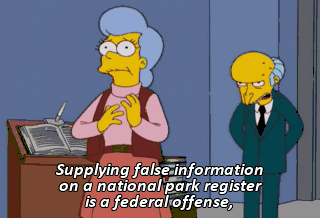 Supplying false information on a national park register is a federal offense,