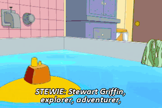STEWIE: Stewart Griffin, explorer, adventurer, skin-diving international playboy. (INHALES DEEPLY) (GROWLING PLAYFULLY) "I'm swimming at night 'cause I'm a slut "and now I'm paying the price for it."
