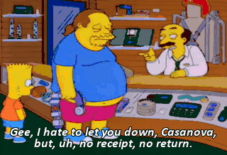 Gee, I hate to let you down, Casanova, but, uh, no receipt, no return.