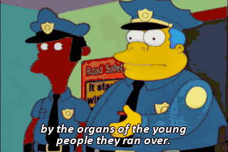 by the organs of the young people they ran over. - Makes you think, huh, Chief? - Not really. Next. Grampa's here to get his driver's license. Okay. Look at the eye chart and cover your left eye.