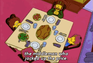 the middleman who jacked up the price. and let's not forget the humane but determined boys over at the slaughterhouse. Hiya, Flanders. Ooh, dinner. May I join you?