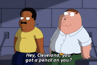 Hey, Cleveland, you got a pencil on you? Oh, gosh, I don't know. - Oh, wait, here you go. - Thanks. (SCREAMS) What the hell? Hey, help, help! We have an emergency! You dick! What's going on in here?