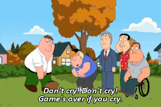Don't cry! Don't cry! Game's over if you cry. (SLURRING) I want you to learn about life, Chris, 'cause of, in life it's like this. Peter, I think you may have had one too many.