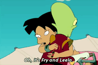 Oh, it's Fry and Leela. Hi, Fry and Leela! Keep pedaling! For the love of God, keep pedaling! Aah! Whew.