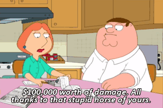 $100,000 worth of damage. All thanks to that stupid horse of yours. Look, can we not talk about the horse, please? It's gone. It suffered a fatal heart attack from the excitement and I disposed of it properly.