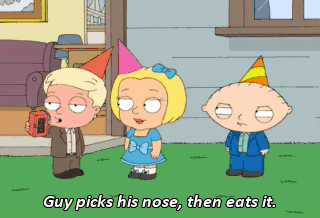 Guy picks his nose, then eats it. Yeah, good luck with that. Hey, Olivia, why don't you and I go get some punch?