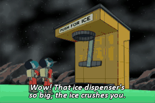Wow! That ice dispenser's so big, the ice crushes you. Yakov Smirnoff said it. No, he didn't. Activating ice drill!