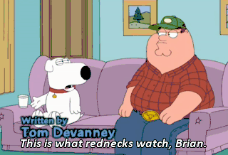 This is what rednecks watch, Brian. Peter, that's disgusting. Here, spit in this cup instead. (SPITS) Oh, there's my apple juice. Stewie, wait! Don't... Ugh! Ah! Aah! Where's my money? You gonna give me my money?