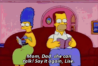 Mom, Dad, she can talk! Say it again, Lise. Bart. Bart, Bart, Bart, Bart, Bart. I'm her first word! Well, I'm not surprised. Lisa's crazy about you. She thinks you hung the moon.