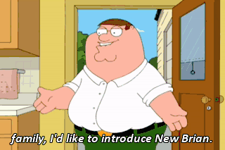 family, I'd like to introduce New Brian. Hey, gang! Whose leg do you have to hump to get a hug around here? (ALL LAUGHING) I like him.